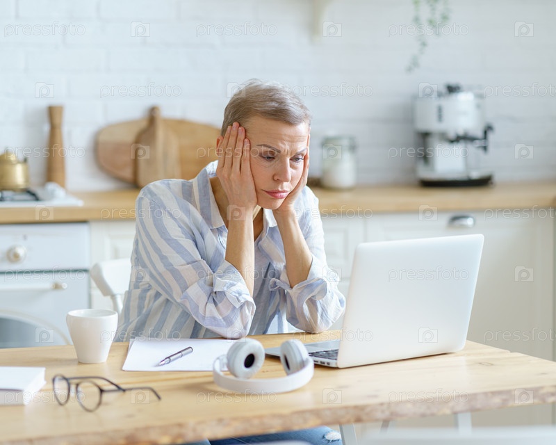 Сбитая с толку пожилая женщина держит голову в руках и смотрит на ноутбук, работая онлайн из дома