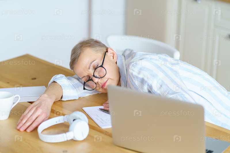 Зрелая женщина спит на столе на кухне дома, отдыхает во время работы или учебы в Интернете