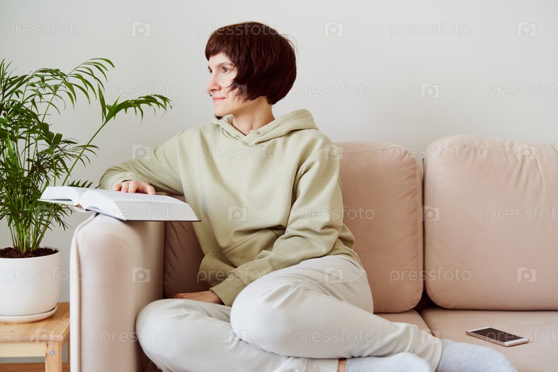 Зрелая женщина читает книгу, сидя на диване, глядя в окно, мечтая и думая. Концепция цифровой детоксикации, свободное время для себя по выходным субботам и воскресеньям. Самопогружение, самопознание