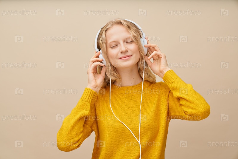 Портрет крупным планом молодой женщины с закрытыми глазами, слушающей музыку через наушники на бежевой стене
