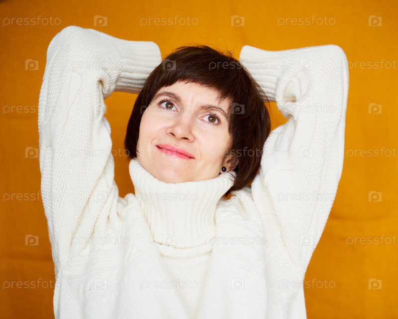 Портрет зрелой женщины, довольной, довольной собой, улыбающейся и мечтающей с саморефлексией