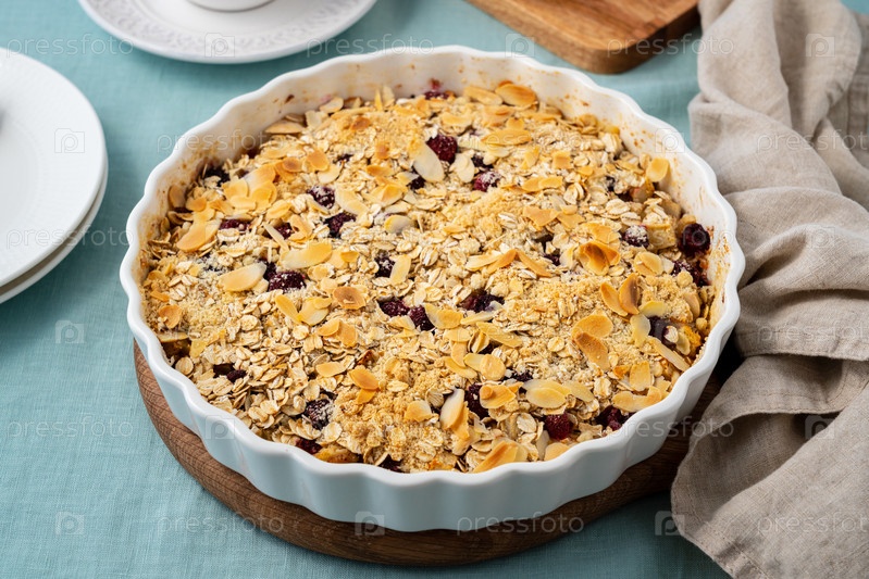 Целое яблоко и груша крошатся с мороженым, штрейзелем. Сладкий десерт, вид сбоку