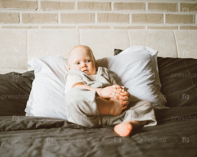 Сладкий мальчик играет ногами, лежа дома на большой кровати