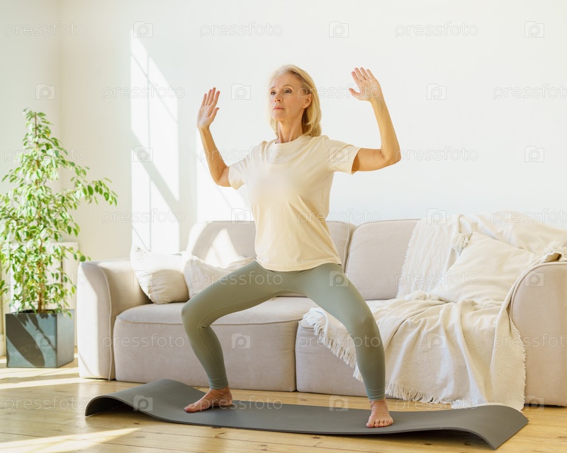 Сосредоточенная взрослая женщина на пенсии в спортивной одежде практикует асану йоги дома, стоя на коврике