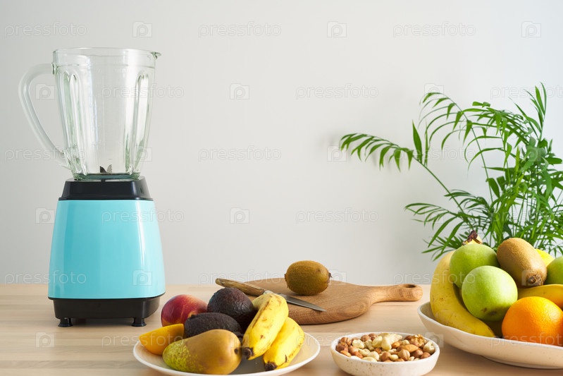 Блендер и смесь ягод, фруктов и овощей для веганского смузи с копией пространства