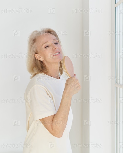 Счастливая пенсионерка веселится дома, поет с расческой свою любимую песню и смотрит в окно