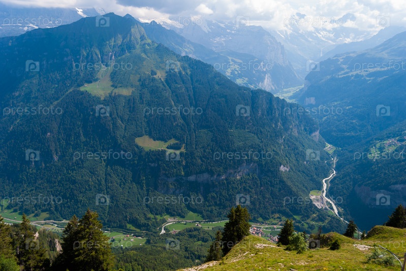Вид сверху на глубокое красивое ущелье в швейцарских Альпах