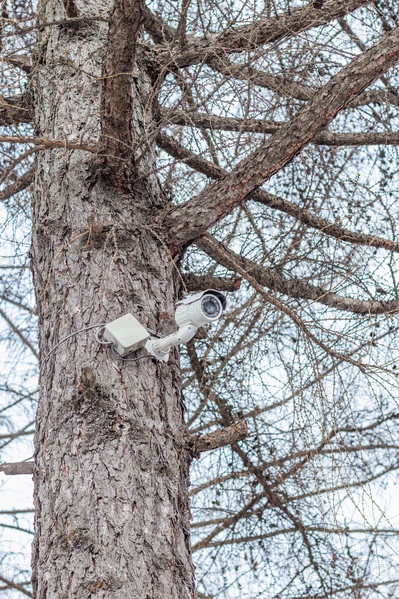 Камера наблюдения установлена на большом дереве. охрана, охрана, наблюдение