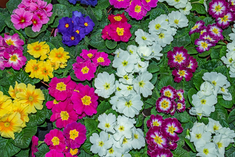 Разноцветные первоцветки для загородного сада, вид сверху. цветущая примула Primula vulgaris. яркий цветочный пейзаж