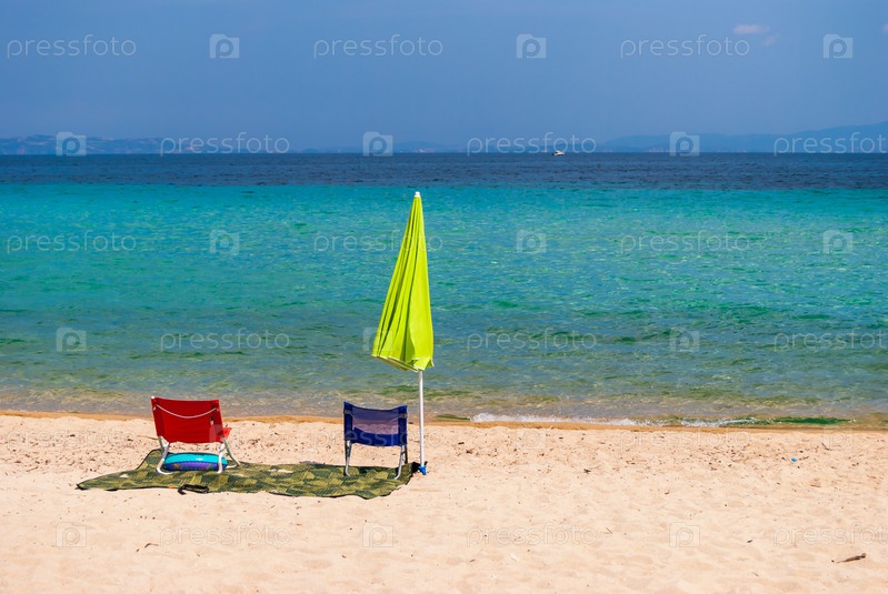 Утро на песчаном пляже греческого побережья. Одинокий зонт и два стула отдыхающие