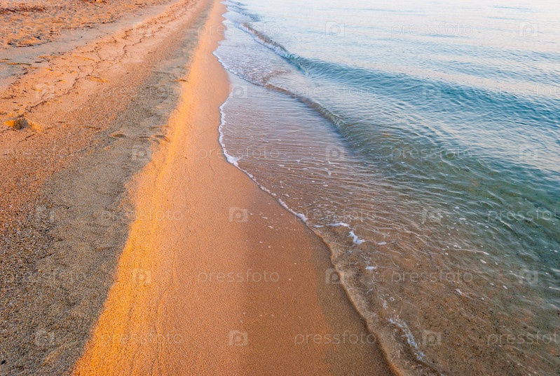 Красивый пустынный песчаный пляж с небольшими волнами прибоя