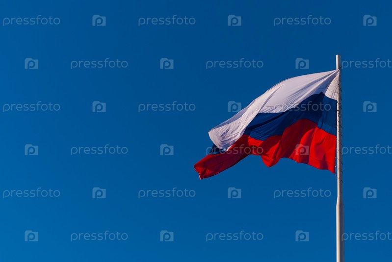 Государственный флаг России на флагштоке развевается ветром на фоне голубого неба. Россия