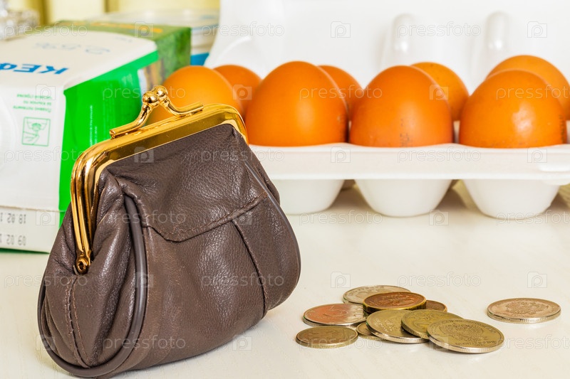 Бумажник, калькулятор, продукты. концепция расчета ежедневных расходов