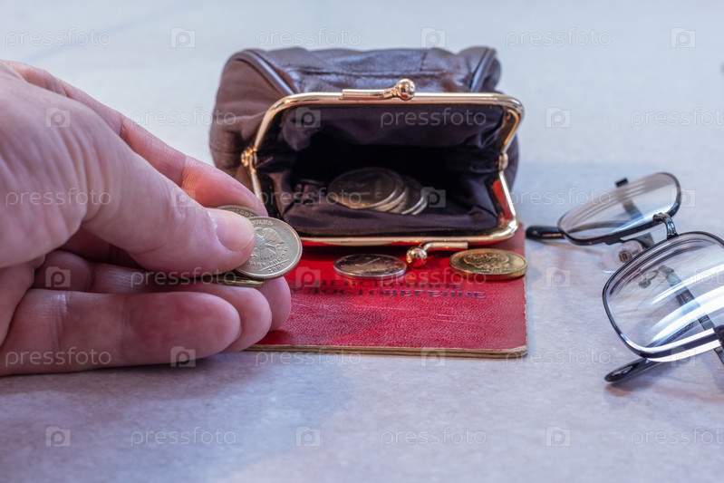 Пенсионное удостоверение, кошелек с деньгами и очки на столе. Надпись на удостоверении: «пенсионное удостоверение»