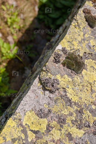 Крупный план серых скал, покрытых мхом, узор сколов, трещин. Гриндельвальд, Швейцария