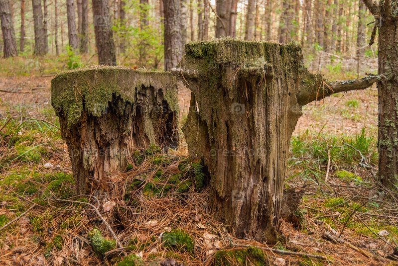 Очень старые гнилые разрушенные деревянные пни. Гнилые пни, мох, природный лес