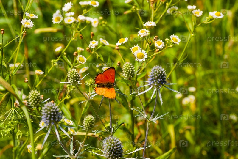 Бабочка на поле травы с теплым светом