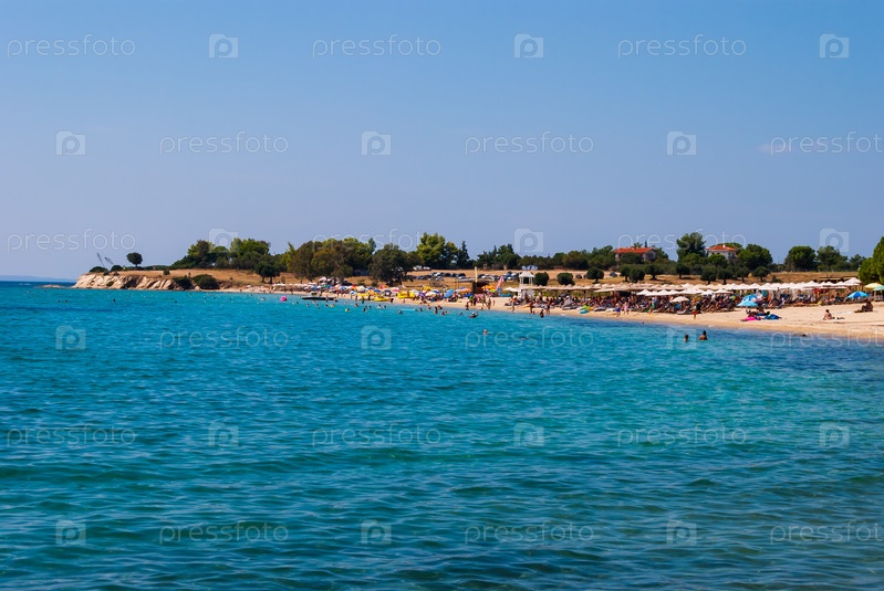 Солнечный красивый летний вид на песчаный пляж с греческим голубым морем с мелкой чистой водой и небольшими скалами. Халкидики Греция