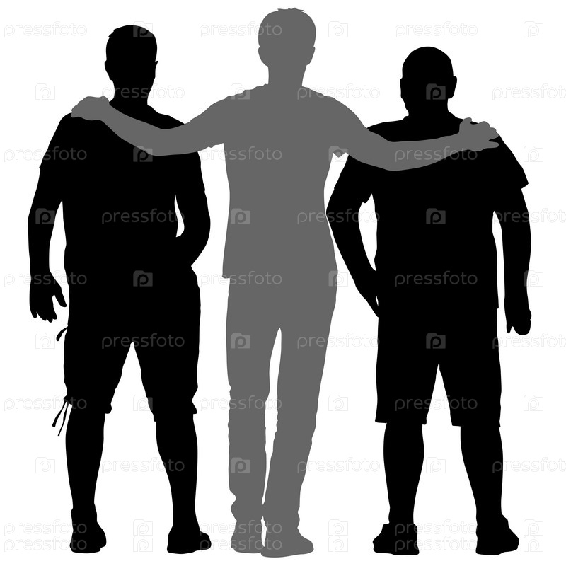 Черный силуэт трое мужчин стоят обнявшись на белом фоне