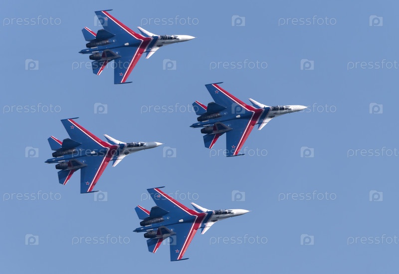 Москва Россия Аэродром Жуковский 25 июля 2021 года: Пилотажные группы Русские Витязи на самолетах Су-35 Международного аэрокосмического салона МАКС-2021