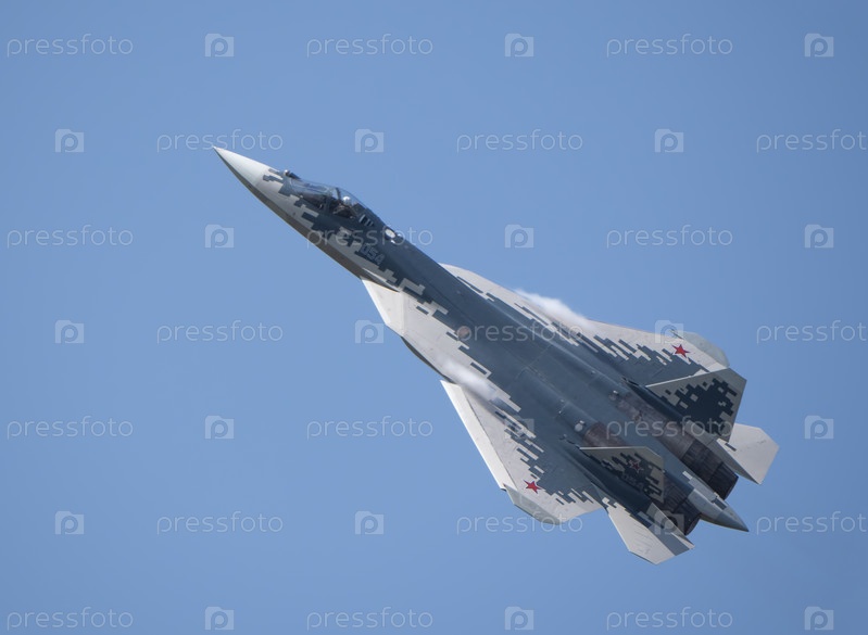 Москва Россия Аэродром Жуковский 25 июля 2021 года: Демонстрация новейшего российского истребителя Су-57 на международном аэрокосмическом салоне МАКС-2021