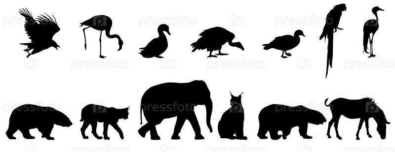 Силуэт слон тигр медведь жираф фламинго пеликан гусь на белом фоне