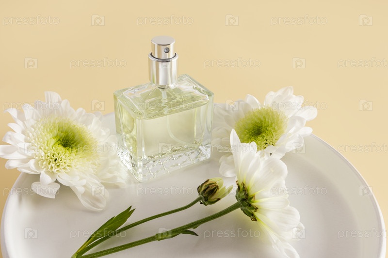 Шикарный флакон парфюмированной воды или спрея стоит на белой керамической тарелке со свежесрезанными цветами хризантемы. передний план. бежевый фон