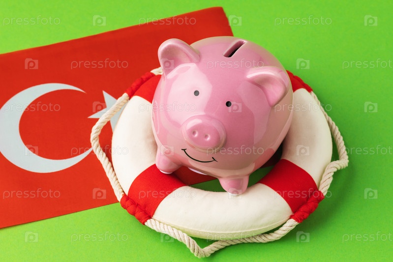 Копилка, спасательный круг и флаг на зеленом фоне, концепция на тему спасения турецкой экономики