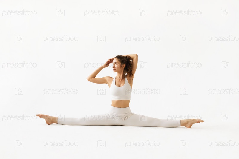 Молодая женщина, ведущая здоровый образ жизни и практикующая йогу, выполняет упражнение самаконасана с руками за головой, поперечным шпагатом, тренируется в белой спортивной одежде на светлом фоне