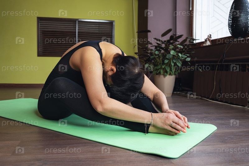 Женщина средних лет ведет здоровый образ жизни и занимается йогой, выполняет упражнения Курмасана для начинающих, позу черепахи, тренируется одна в фитнес-студии, сидит на коврике в черной спортивной одежде