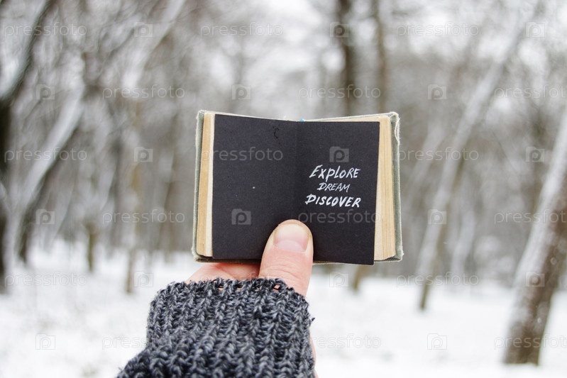 Исследуй мечту, открывай. Рука держит книгу с надписью