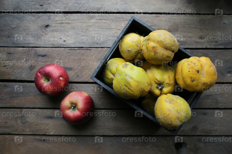Спелая айва в коробке на деревянном столе