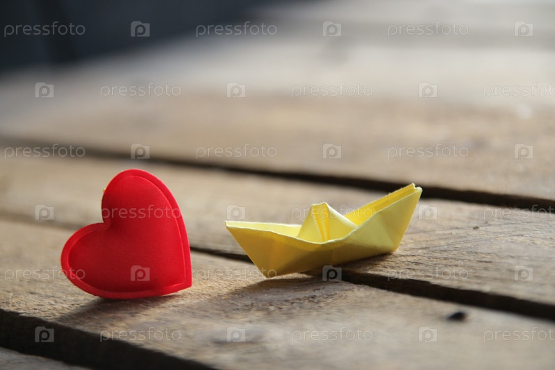 Красное сердце на деревянном фоне и бумажный кораблик. Место для текста. Валентин