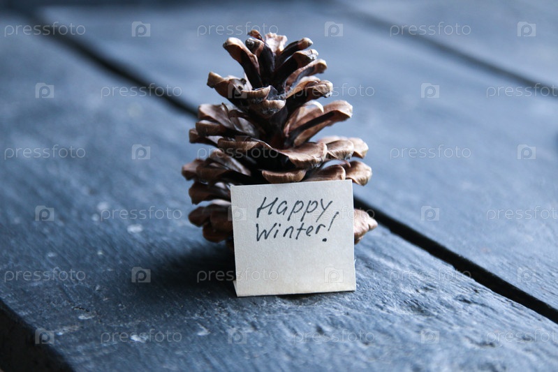 Концепция счастливой зимы. Надпись на бирке и еловой шишке
