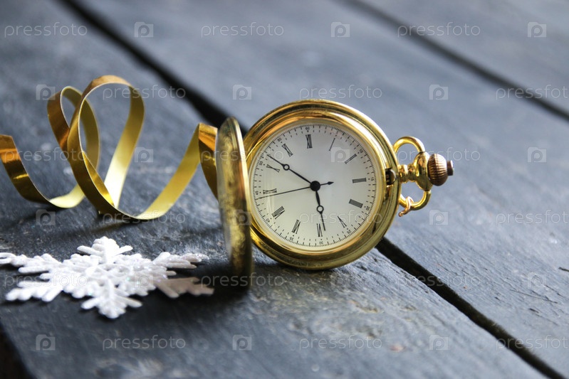 Креативная концепция зимнего времени. Золотые карманные часы и снежинка