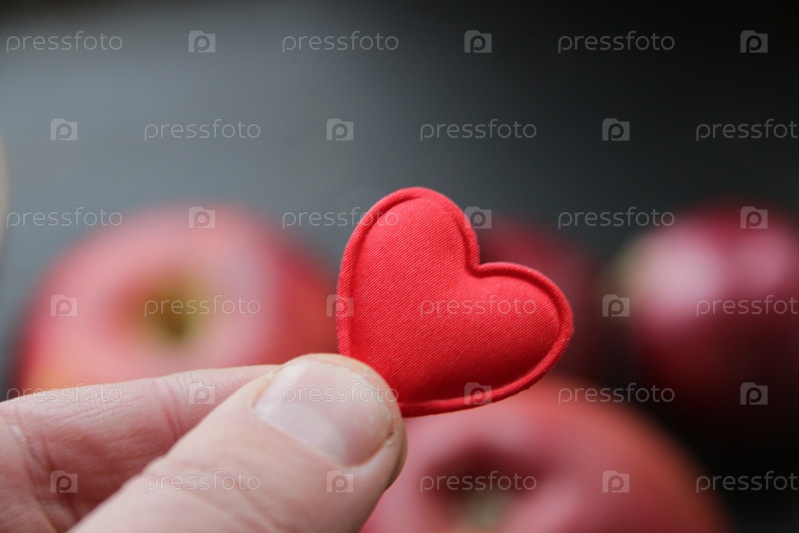 Концепция здорового питания. Рука держит сердце на фоне яблока