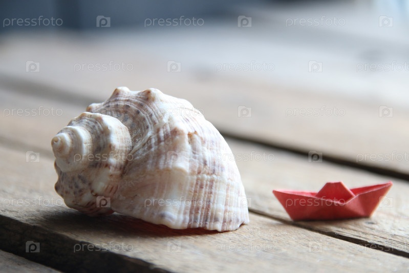 Раковина на деревянном фоне. Морской фон