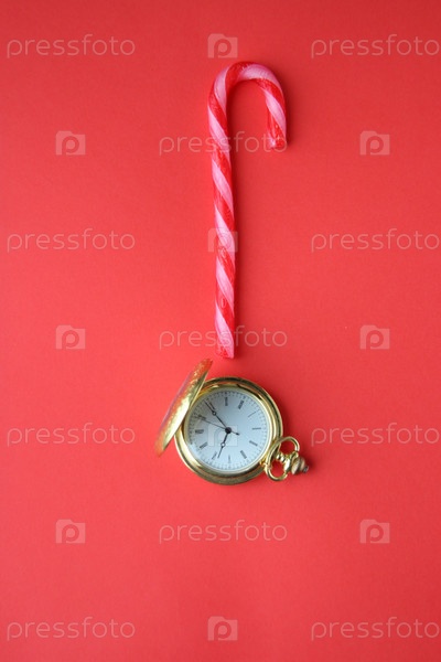 Веселая рождественская открытка. Карманные часы и леденец