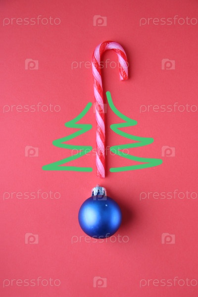 Веселая рождественская открытка. Рождественская елка. Конфета и Рождественская безделушка