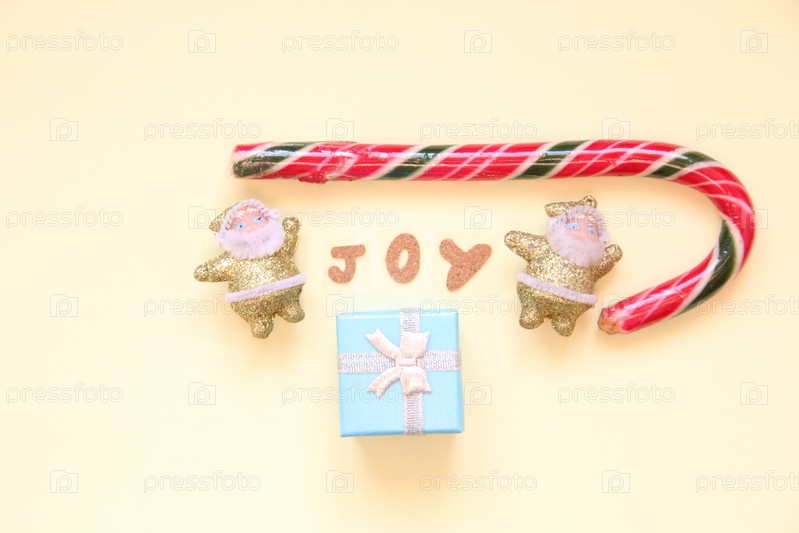 Надпись Joy и два Санта-Клауса на желтом фоне