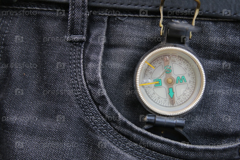 Концепция поиска - ретро компас в кармане джинсов