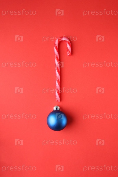 Веселая рождественская открытка. Конфета на красном фоне