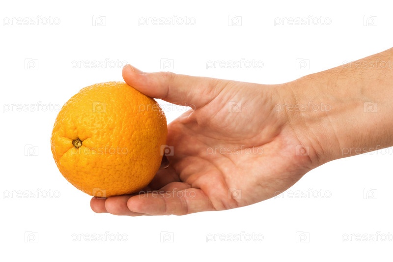 Мужская рука держит апельсин на белом фоне, шаблон для дизайнера