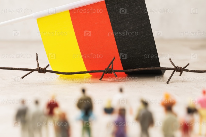 Колючая проволока, флаг Германии и пластиковые игрушечные человечки не в фокусе, концепция незаконного пересечения границы мигрантами