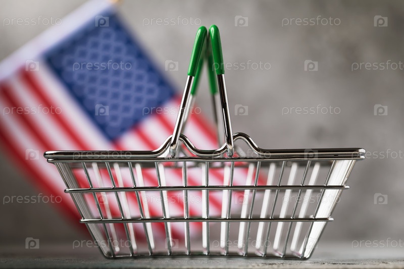 Пустая корзина для продуктов на фоне флага Соединенных Штатов Америки, концепция продовольственного кризиса