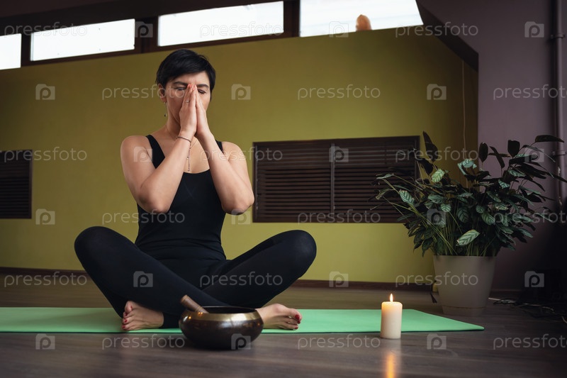 Женщина средних лет, практикующая йогу, медитирует, сидя на коврике в позе лотоса с намасте, тренируется в комнате с пранаямой