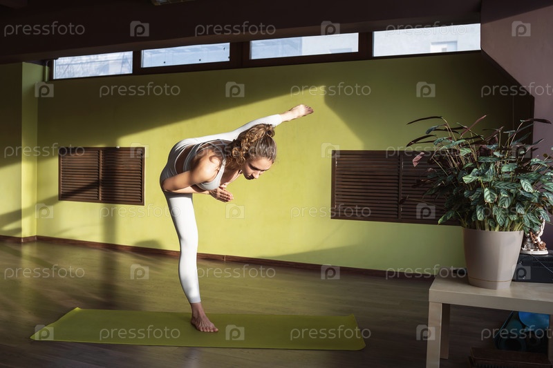 Молодая спортивная женщина, практикующая йогу, выполняющая вариацию упражнения Адхомукха Утхитахаста Падангуштхасана № 2, балансируя на одной ноге, тренируясь в белой спортивной одежде в комнате