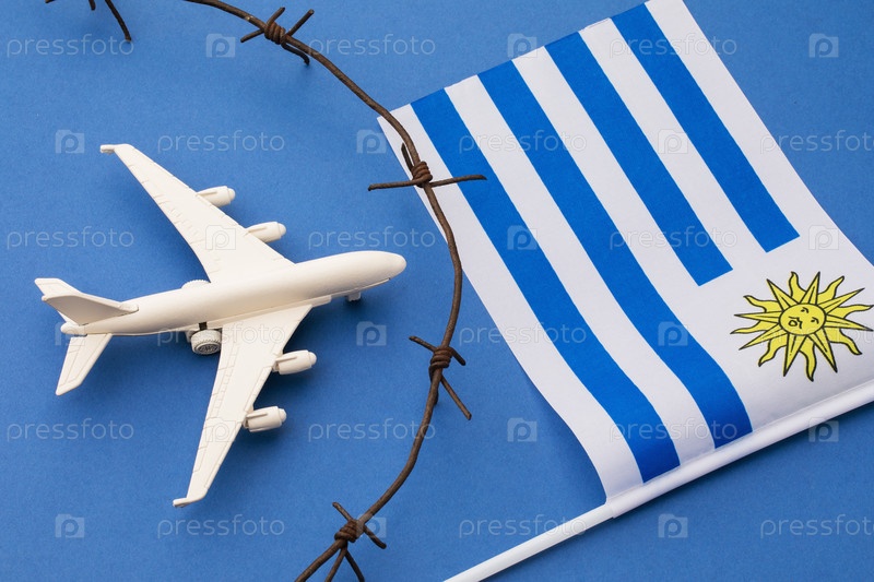Игрушечный самолет, флаг и колючая проволока на синем фоне, концепция закрытой воздушной границы Уругвая