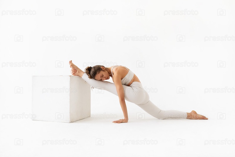 Молодая женщина, практикующая йогу, выполняющая вариацию упражнения Хануманасана, продольный шпагат с опорой ноги на куб, тренируется в белой спортивной одежде в студии на светлом фоне