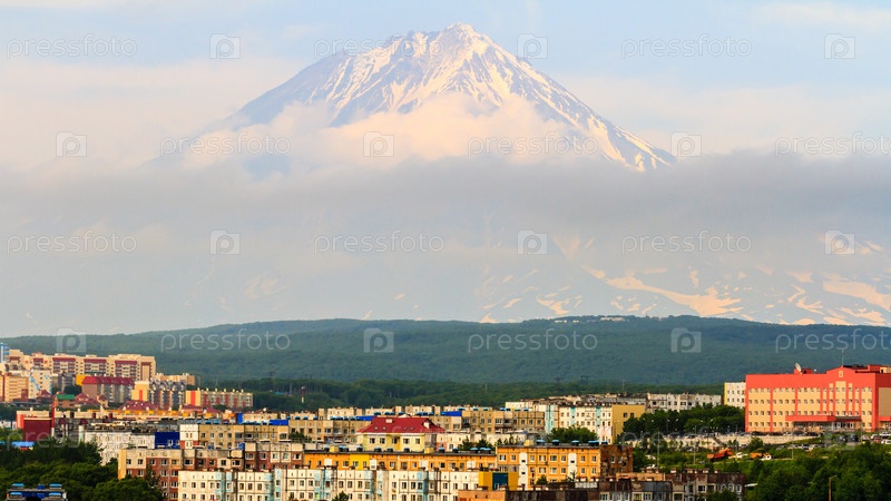 Вид на город Петропавловск-Камчатский на фоне Корякского вулкана. Камчатка, Россия